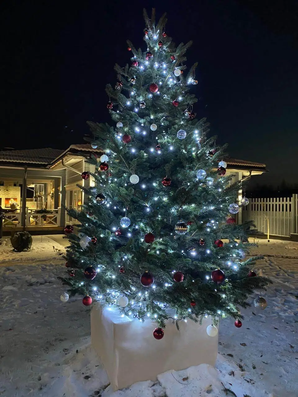 установлена живая елка, украшена игрушками